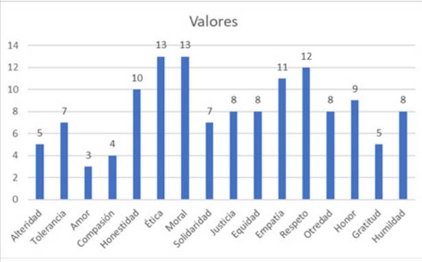 Los valores de la alteridad y otredad fueron seleccionados en un 5 y 8% respectivamente por los estudiantes