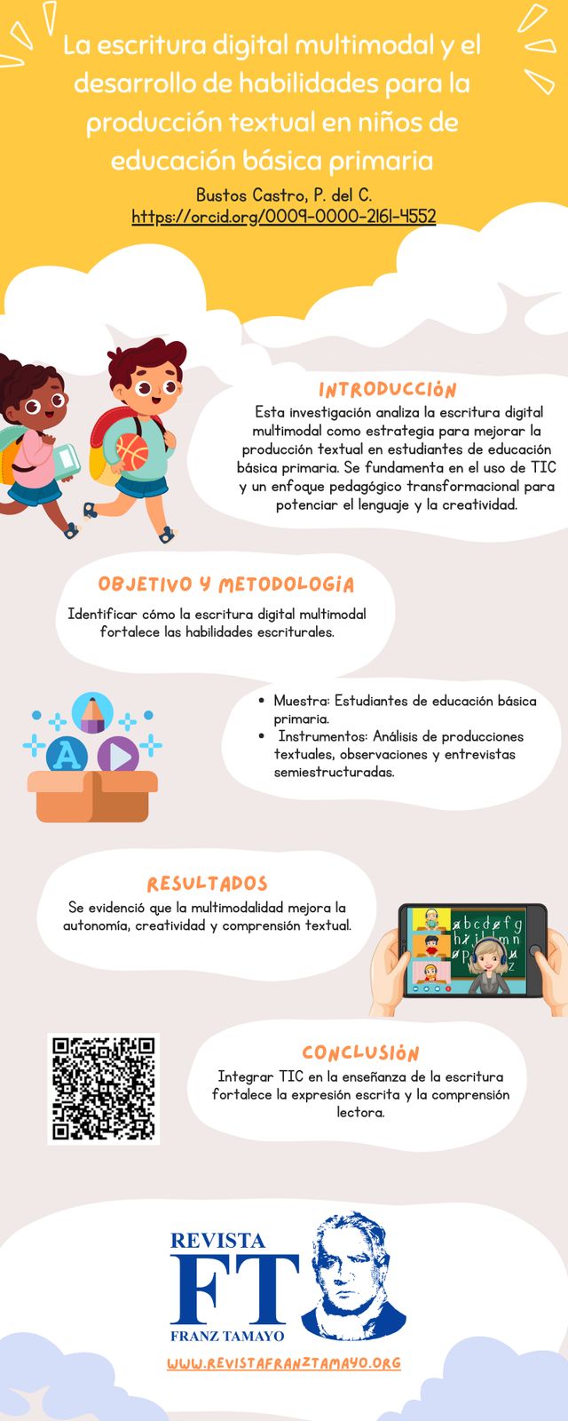 La investigación aborda la temática del impacto de la escritura digital multimodal en el desarrollo de habilidades de producción textual en estudiantes de primaria. El objetivo fue explorar cómo los entornos virtuales, ricos en recursos TIC, y una pedagogía transformacional pueden potenciar la lectoescritura, fomentando la creación textual autónoma y situada. El método empleado es cualitativo de corte interpretativo, con diseño no experimental, dirigido a un ejercicio comprensivo de la realidad escolar en el aprendizaje de la escritura. Los hallazgos giran en torno a la necesidad de que se articulen las prácticas curriculares para contar con una línea pedagógica clara respecto a las habilidades comunicativas, con una mediación efectiva y fundamentada de las TIC y los escenarios múltiples que abre la virtualidad y el desarrollo tecnológico a la educación. Se concluye que la escritura digital multimodal permite avanzar en la transformación de los procesos de enseñanza y aprendizaje de la producción textual.