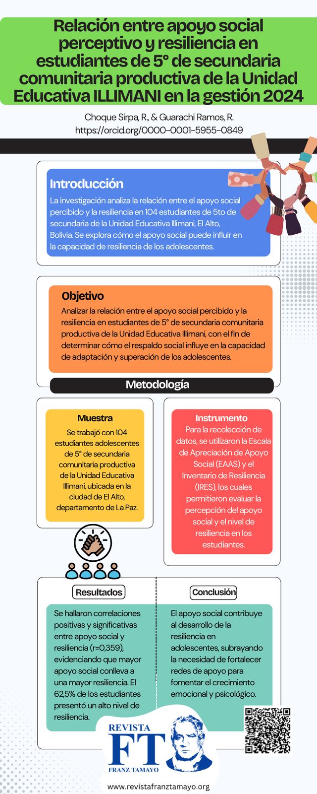 The research describes the relationship between perceived social support and resilience in 104 adolescent students from the 5th year of productive community secondary school at Unidad Educativa Illimani in the city of El Alto, La Paz department. The main objective was to describe the relationship between perceived social support and student resilience, hypothesizing that both variables are positively related. A quantitative approach was employed, with a non-experimental and correlational design. The instruments used for data collection were the Social Support Appraisal Scale (EAAS) and the Resilience Inventory (IRES). The results revealed positive and statistically significant correlations between perceived social support and resilience (r=0,359**), supporting the proposed hypothesis. This suggests that as the perception of social support increases, a corresponding increase in the level of student resilience is observed, considering that social support contributes to the development of resilience in adolescents. Additionally, a moderate and highly significant positive correlation was observed between the dimension of “other people” and student resilience. 54.8% of the students reported a medium level of perceived social support, while 62.5% showed a high level of resilience. These findings highlight the importance of having strong support networks for the development of resilience in adolescents. The research emphasizes the relevance of fostering and strengthening social support to promote optimal psychological and emotional growth.